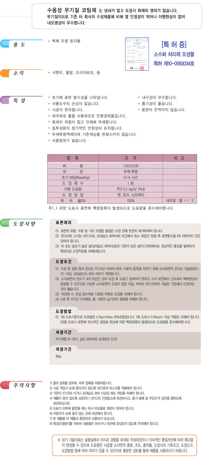 제품명 : 수용성 무기질 코팅제 용도 : 벽체 오염 방지용 소지 : 시멘트, 몰탈, 드라이비트, 등 인증및특허 : 소수화물 처리제 조성물[특허 제 10-0583034호] 바닥제 도료 방수제 도료 KS인증 및 특허제품 벽체용 도료 인테리어용 도료 발수제 기타제품 각종도장용구 ▲TOP