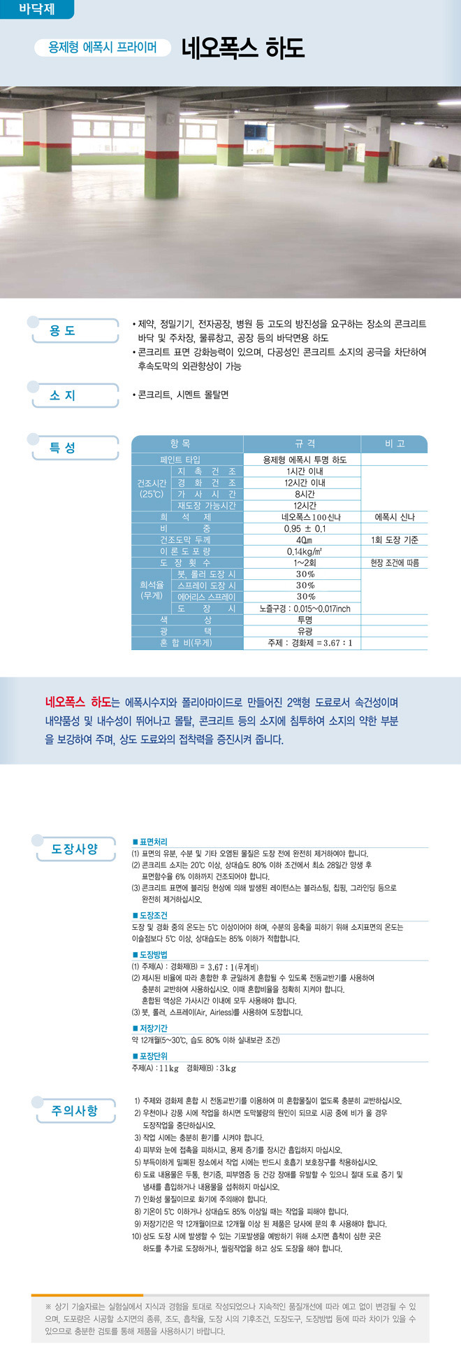 제품명 : 네오폭스 하도 용도 : 제약,정밀기기,전자공장,병원등 고도의 방진성을 요구하는 장소의 콘크리트바닥 및 주차장, 물류창고, 공장등의 바닥면용 하도 소지 : 콘크리트, 시멘트 몰탈면 바닥제 도료 방수제 도료 KS인증 및 특허제품 벽체용 도료 인테리어용 도료 발수제 기타제품 각종도장용구 ▲TOP