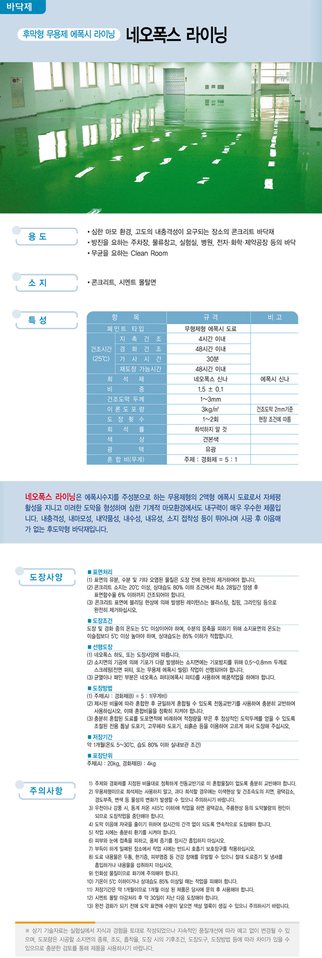 제품명 : 네오폭스 라이닝 용도 : 심한 마모 환경, 고도의 내충격성이 요구되는 장소의 콘크리트 바닥재 소지 : 콘크리트, 시멘트 몰탈면 바닥제 도료 방수제 도료 KS인증 및 특허제품 벽체용 도료 인테리어용 도료 발수제 기타제품 각종도장용구 ▲TOP