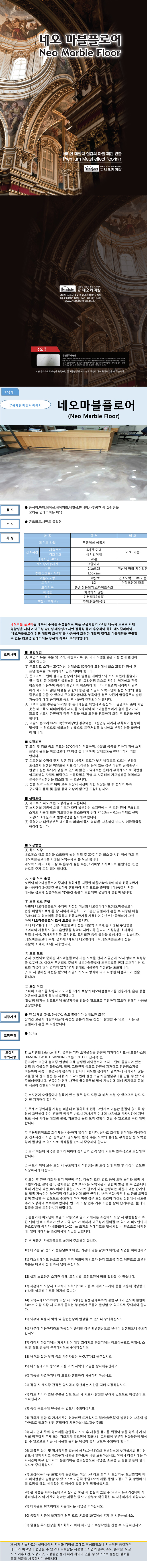 제품명 : 네오마블플로어 용도 : 음식점,까페,헤어샵,베이커리,네일샵,전시장,사무공간 등 화려함을 요하는 인테리어용 바닥 소지 : 콘크리트,시멘트 몰탈면 바닥제 도료 방수제 도료 KS인증 및 특허제품 벽체용 도료 인테리어용 도료 발수제 기타제품 각종도장용구 ▲TOP