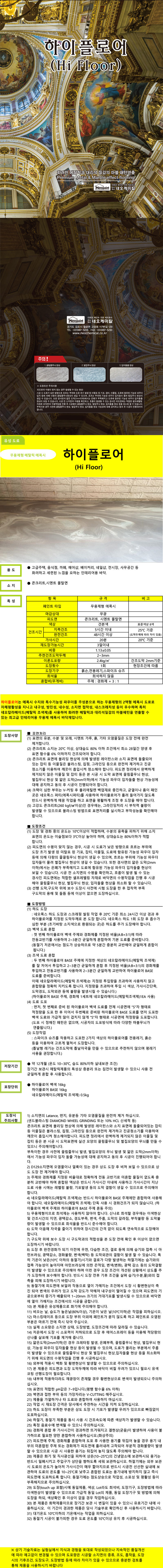 제품명 : 하이플로어 용도 : 고급주택, 음식점, 까페, 헤어샵, 베이커리, 네일샵, 전시장, 사무공간 등 화려하고 세련된 느낌을 요하는 인테리어용 바닥. 소지 : 콘크리트,시멘트 몰탈면 바닥제 도료 방수제 도료 KS인증 및 특허제품 벽체용 도료 인테리어용 도료 발수제 기타제품 각종도장용구 ▲TOP