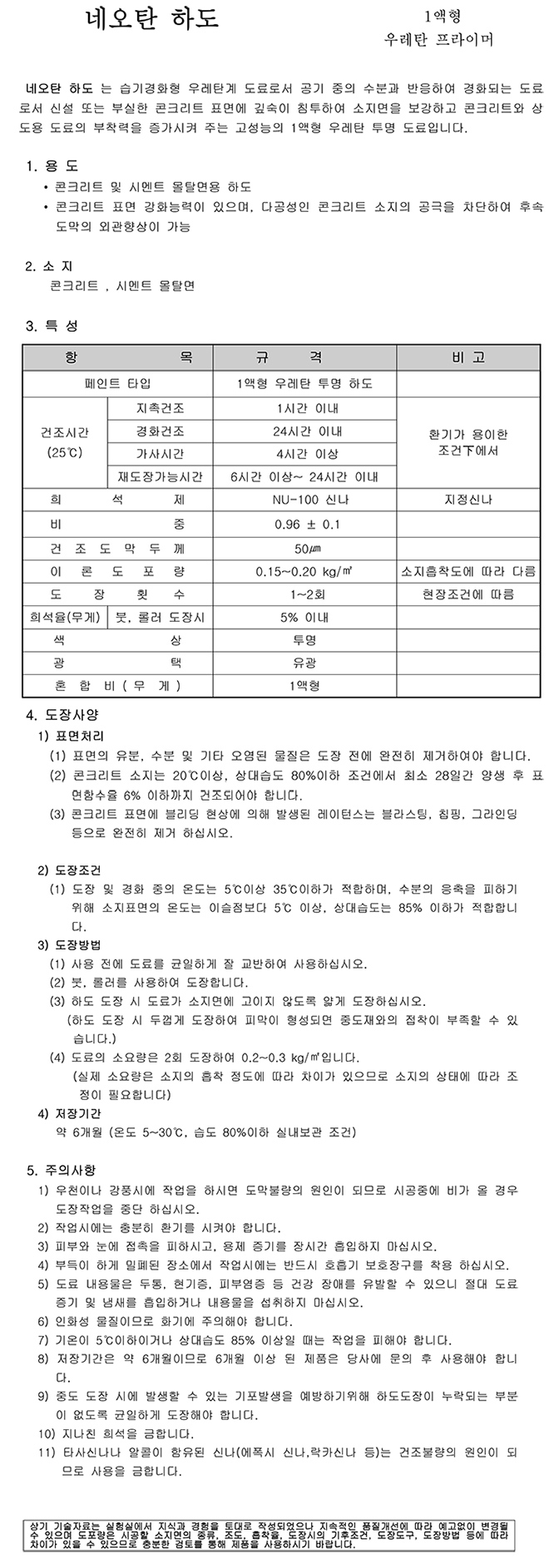 제품명 : 네오탄 하도 용도 : 콘크리트 및 시멘트 몰탈면용 하도 소지 : 콘크리트 , 시멘트 몰탈면 바닥제 도료 방수제 도료 KS인증 및 특허제품 벽체용 도료 인테리어용 도료 발수제 기타제품 각종도장용구 ▲TOP