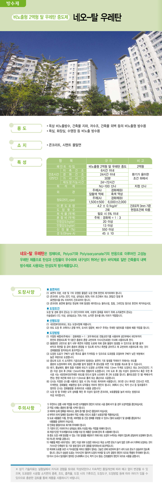 제품명 : 네오-탈 우레탄 용도 : 옥상 비노출방수, 건축물 지하, 저수조, 건축물 외벽 등의 비노출형 방수용 소지 : 콘크리트, 시멘트 몰탈면 바닥제 도료 방수제 도료 KS인증 및 특허제품 벽체용 도료 인테리어용 도료 발수제 기타제품 각종도장용구 ▲TOP