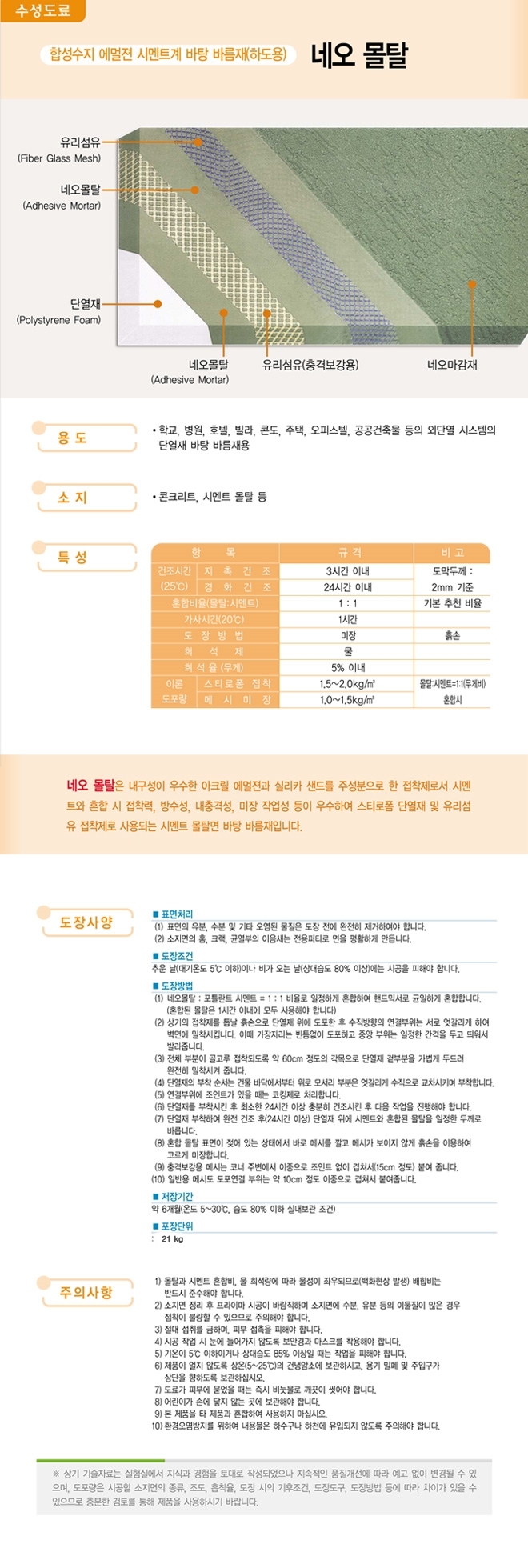 제품명 : 네오 몰탈 용도 : 학교, 병원, 호텔, 빌라, 콘도, 주택, 오피스텔, 공공건축물 등의 외단열 시스템의 단열재의 바탕 바름재요 소지 : 콘크리트, 시멘트 몰탈 등 바닥제 도료 방수제 도료 KS인증 및 특허제품 벽체용 도료 인테리어용 도료 발수제 기타제품 각종도장용구 ▲TOP
