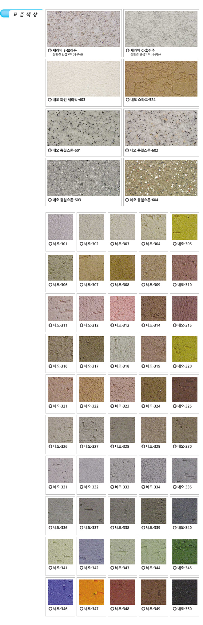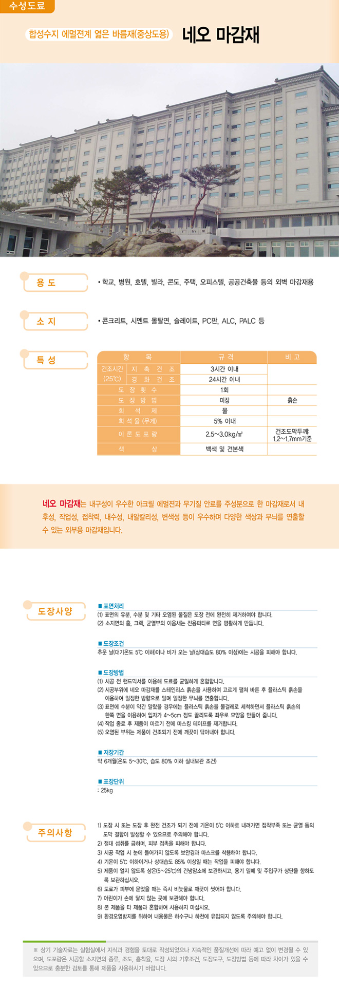 제품명 : 네오 마감재 용도 : 학교, 병원, 호텔, 빌라, 콘도, 주택, 오피스텔, 공공건축물 등의 외벽 마감재용 소지 : 콘크리트, 시멘트 몰탈, 슬레이트, PC판, ALC, PALC 등 바닥제 도료 방수제 도료 KS인증 및 특허제품 벽체용 도료 인테리어용 도료 발수제 기타제품 각종도장용구 ▲TOP