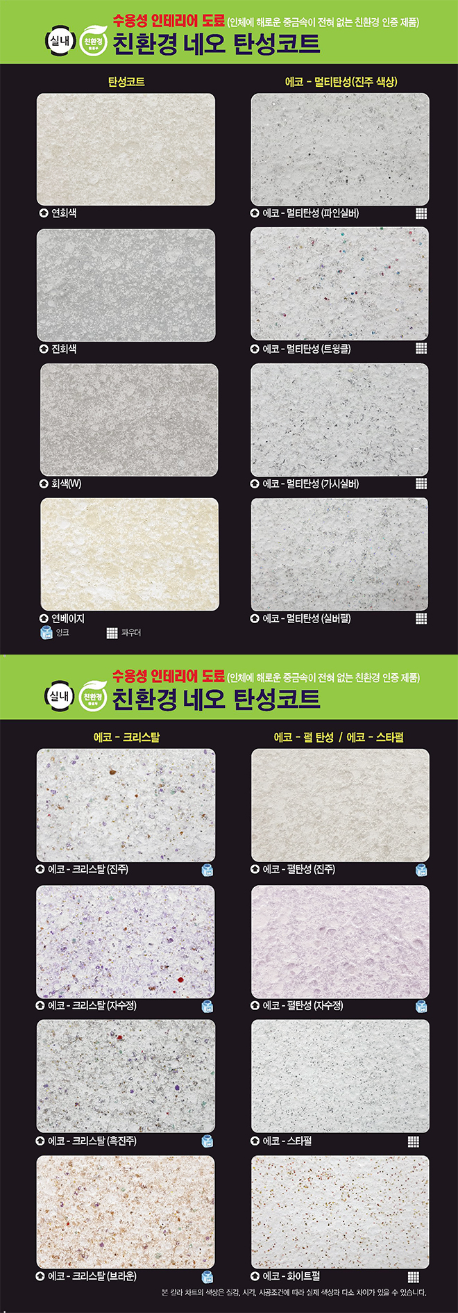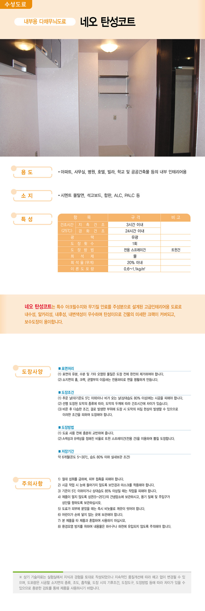 제품명 : 네오 탄성코트 [네오탄성Ⅰ] 용도 : 아파트, 사무실, 병원, 호텔, 빌라, 학교 및 공공건축물 등의 내부 인테리어용 소지 : 시멘트, 몰탈면, 석고보드, 합판, ALC, PALC 등 바닥제 도료 방수제 도료 KS인증 및 특허제품 벽체용 도료 인테리어용 도료 발수제 기타제품 각종도장용구 ▲TOP