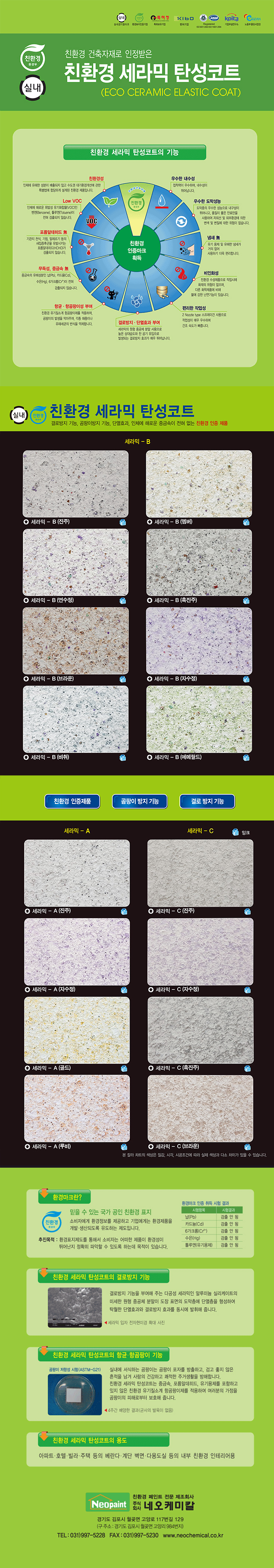 제품명 : 친환경 세라믹 탄성코트 용도 : 아파트·호텔·빌라·주택 등의 베란다·계단 벽면·다용도실 등의 내부 친환경 인테리어용 소지 : 시멘트, 몰탈면, 석고보드, 합판, ALC 바닥제 도료 방수제 도료 KS인증 및 특허제품 벽체용 도료 인테리어용 도료 발수제 기타제품 각종도장용구 ▲TOP