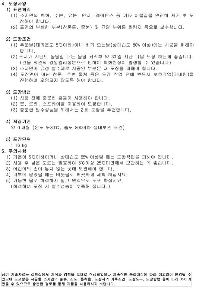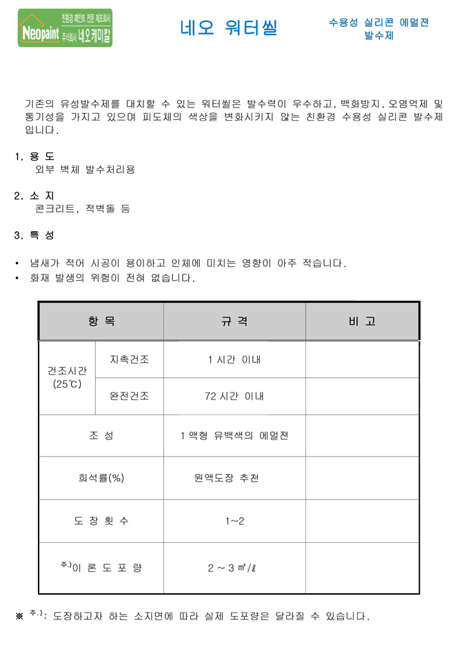 제품명 : Neo Water Seal (네오워터씰) 용도 : 외부 벽체 발수처리용 소지 : 콘크리트 및 시멘트 몰탈 바닥제 도료 방수제 도료 KS인증 및 특허제품 벽체용 도료 인테리어용 도료 발수제 기타제품 각종도장용구 ▲TOP